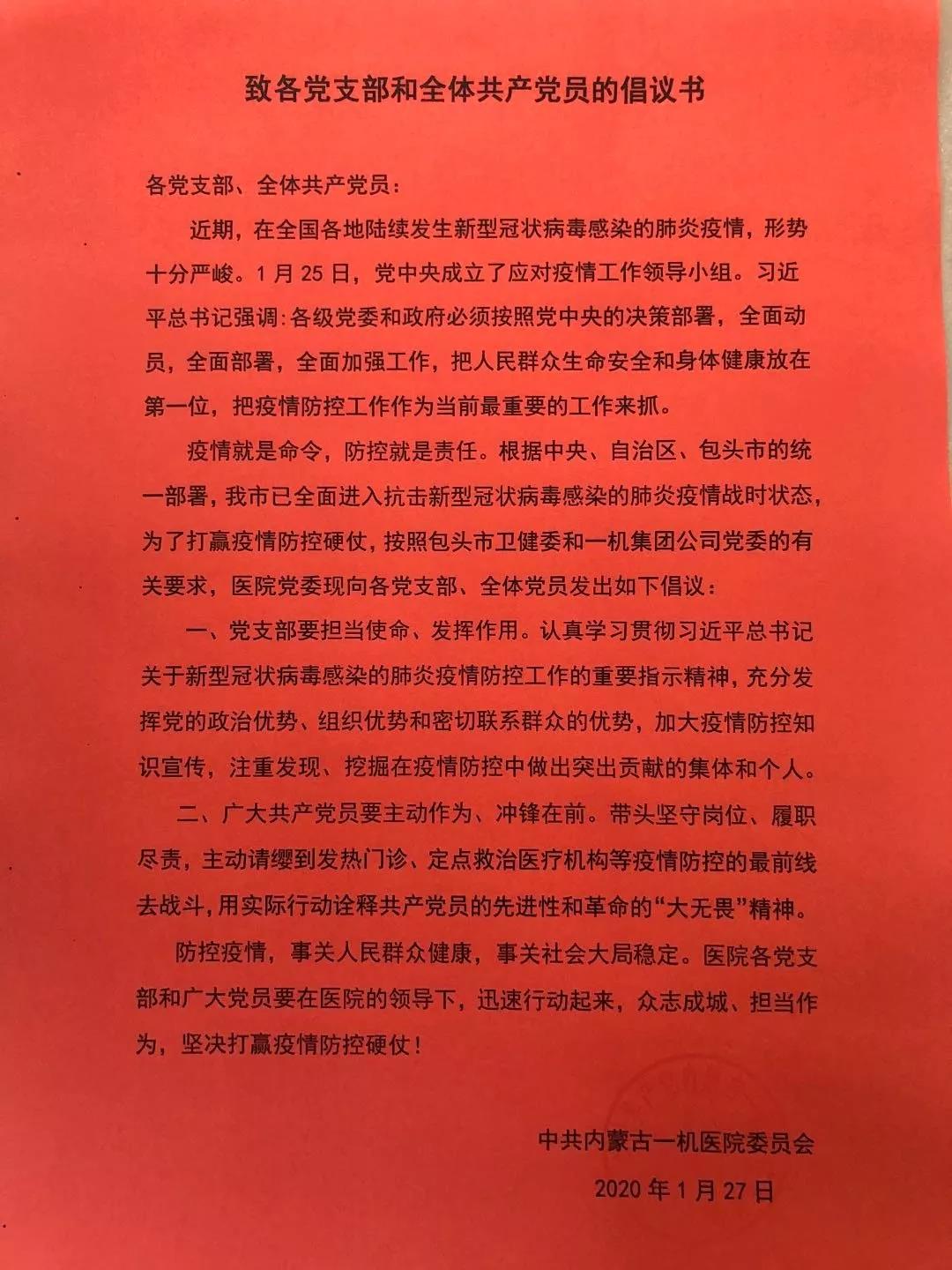 1月27日,中國兵器工業集團一機集團醫院院黨委向全院黨員發出號召,號召黨員帶頭組建“醫護突擊隊”,作為預備力量,隨時準備投入到抗擊疫情的第一線。內蒙古一機醫院內系黨支部、外系黨支部、門診黨支部、藥放化黨支部、口腔黨支部、機關第一黨支部、機關第二黨支部等7個黨支部的黨員和群眾均積極請纓,要求加入到抗擊疫情的一線。一張張按著紅手印的請戰書紛紛發到內蒙古一機醫院先鋒黨員群,有的以個人名義請戰,有的以支部名義請戰。
