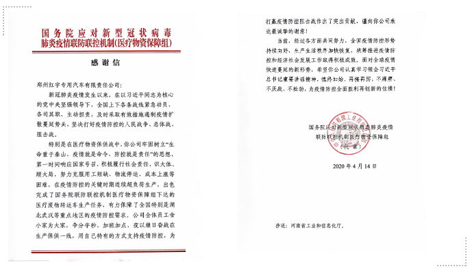 近日,中國兵器工業集團豫西集團鄭州紅宇專汽公司、一機集團和北重集團分別收到國務院應對新型冠狀病毒肺炎疫情聯防聯控機制醫療物資保障組,包頭市青山區委、區政府發來的感謝信、慰問信,對他們在打贏疫情防控人民戰爭、總體戰、阻擊戰中作出的貢獻表示感謝。 豫西集團鄭州紅宇專汽公司收到國務院聯防聯控機制感謝信 4月14日,國務院應對新型冠狀病毒肺炎疫情聯防聯控機制醫療物資保障組向中國兵器工業集團豫西集團鄭州紅宇專汽公司發來感謝信。 豫西集團鄭州紅宇專汽公司收到國務院應對新型冠狀病毒肺炎疫情聯防聯控機制醫療物資保障組發來的感謝信 信中指出,新冠肺炎疫情發生以來,在以習近平同志為核心的黨中央堅強領導下,全國上下各條戰線緊急動員、各司其職、主動擔責,及時采取有效措施遏制疫情擴散蔓延勢頭,堅決打好疫情防控的人民戰爭、總體戰、阻擊戰。 特別是在醫療物資保供戰中,鄭州紅宇專汽公司牢固樹立“生命重于泰山、疫情就是命令、防控就是責任”的思想,第一時間響應國家號召,積極履行社會責任,識大體、顧大局,努力克服用工短缺、物流停運、成本上漲等困難,在疫情防控的關鍵時期連續超負荷生產,出色完成了國務院聯防聯控機制醫療物資保障組下達的醫療廢物轉運車生產任務,有力保障了全國特別是湖北武漢等重點地區的疫情防控需求。公司全體員工舍小家為大家、爭分奪秒、加班加點,夜以繼日奮戰在生產保供一線,用自己特有的方式支持疫情防控,為打贏疫情防控阻擊戰作出了突出貢獻。 鄭州紅宇專汽公司緊急生產醫療廢物轉運車并及時發運 疫情發生以來,鄭州紅宇專汽公司已簽約醫療廢物轉運車107臺,累計下線90臺,交付83臺。 一機集團和北重集團收到中共包頭市青山區委員會、青山區人民政府發來的感謝信和慰問信 4月13日,中共包頭市青山區委員會、青山區人民政府向中國兵器工業集團一機集團和北重集團發來感謝信和慰問信,對參與青山區防控疫情一線工作的一機集團、北重集團黨員干部職工及給予充分理解、全力支持的家屬們,表示衷心的感謝并致以最崇高的敬意!