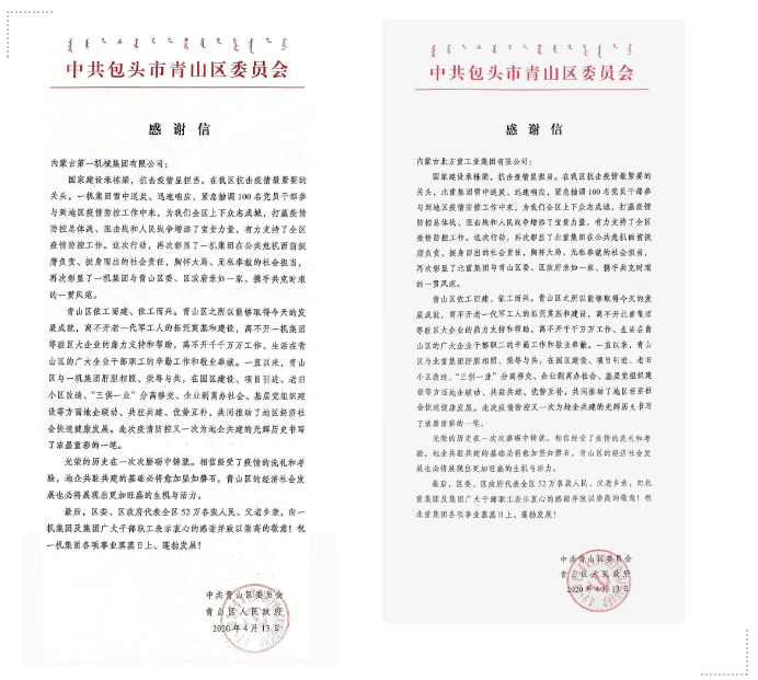 一機集團、北重集團收到中共包頭市青山區委員會、青山區人民政府發來的慰問信 信中指出,在青山區抗擊疫情最緊要的關頭,一機集團、北重集團雪中送炭、迅速響應,分別緊急抽調百余名黨員干部參與到地區疫情防控工作中,為全區上下眾志成城,打贏疫情防控的人民戰爭、總體戰、阻擊戰增添了寶貴力量,有力支持了全區疫情防控工作,彰顯了一機集團、北重集團在公共危機面前挺膺負責、挺身而出的社會責任,胸懷大局、無私奉獻的社會擔當。 一機集團黨員干部馳援青山區疫情防控一線 北重集團黨員干部馳援青山區疫情防控一線 來源/豫西集團紅宇專汽公司、一機集團、北重集團