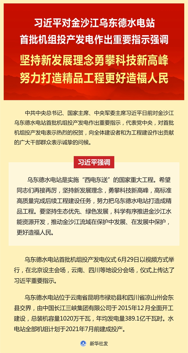 新華社北京6月29日電 中共中央總書(shū)記、國(guó)家主席、中央軍委主席習(xí)近平日前對(duì)金沙江烏東德水電站首批機(jī)組投產(chǎn)發(fā)電作出重要指示,代表黨中央,對(duì)首批機(jī)組投產(chǎn)發(fā)電表示熱烈的祝賀,向全體建設(shè)者和為工程建設(shè)作出貢獻(xiàn)的廣大干部群眾表示誠(chéng)摯的問(wèn)候。 習(xí)近平強(qiáng)調(diào),烏東德水電站是實(shí)施“西電東送”的國(guó)家重大工程。希望同志們?cè)俳釉賲枺瑘?jiān)持新發(fā)展理念,勇攀科技新高峰,高標(biāo)準(zhǔn)高質(zhì)量完成后續(xù)工程建設(shè)任務(wù),努力把烏東德水電站打造成精品工程。要堅(jiān)持生態(tài)優(yōu)先、綠色發(fā)展,科學(xué)有序推進(jìn)金沙江水能資源開(kāi)發(fā),推動(dòng)金沙江流域在保護(hù)中發(fā)展、在發(fā)展中保護(hù),更好造福人民。 烏東德水電站首批機(jī)組投產(chǎn)發(fā)電儀式29日以視頻方式舉行,在北京設(shè)主會(huì)場(chǎng),云南、四川等地設(shè)分會(huì)場(chǎng),儀式上傳達(dá)了習(xí)近平重要指示。 烏東德水電站位于云南省昆明市祿勸縣和四川省涼山州會(huì)東縣交界,由中國(guó)長(zhǎng)江三峽集團(tuán)有限公司于2015年12月全面開(kāi)工建設(shè),總裝機(jī)容量1020萬(wàn)千瓦,年均發(fā)電量389.1億千瓦時(shí)。水電站全部機(jī)組計(jì)劃于2021年7月前建成投產(chǎn)。
