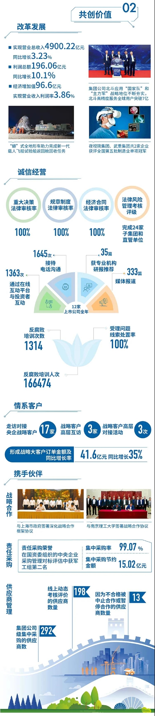 近日,國務(wù)院國資委在京舉辦“責(zé)任創(chuàng)造價(jià)值,責(zé)任引領(lǐng)未來——中央企業(yè)社會責(zé)任報(bào)告集中發(fā)布活動(dòng)(2021)”,來自中央企業(yè)的92份《報(bào)告》向公眾全面展示央企認(rèn)真履行社會責(zé)任的成果。兵器工業(yè)集團(tuán)參加集中發(fā)布活動(dòng),并向社會公眾正式發(fā)布第十二份年度社會責(zé)任報(bào)告——《中國兵器工業(yè)集團(tuán)有限公司2020年社會責(zé)任報(bào)告》,全面披露2020年度集團(tuán)公司履責(zé)實(shí)踐和履責(zé)成效。會上發(fā)布了《中央企業(yè)社會責(zé)任藍(lán)皮書(2021)》,《中國兵器工業(yè)集團(tuán)有限公司:內(nèi)化于心外化于行,打造央企責(zé)任管理表率》成功入選典型案例。 2020年,是“十三五”規(guī)劃收官之年,也是全面建成小康社會、實(shí)現(xiàn)第一個(gè)百年目標(biāo)的決勝之年。集團(tuán)公司黨組書記、董事長焦開河在報(bào)告開篇指出,集團(tuán)公司實(shí)現(xiàn)了“十三五”圓滿收官,整體步入了高質(zhì)量發(fā)展軌道,呈現(xiàn)出基礎(chǔ)更牢、動(dòng)力更強(qiáng)、空間更大、效能更高的積極向上良好態(tài)勢。在“十三五”特別是近三年來的工作實(shí)踐中,我們明確了“集團(tuán)公司是國家安全和國防建設(shè)的脊梁、是國家戰(zhàn)略科技力量最為重要的組成部分、是黨和國家最可信賴的‘六個(gè)力量’,肩負(fù)著支撐國防軍隊(duì)建設(shè)、推動(dòng)科技自立自強(qiáng)、服務(wù)構(gòu)建新發(fā)展格局的重大政治責(zé)任和光榮使命,具有極強(qiáng)的政治屬性,性質(zhì)特殊、使命特殊、責(zé)任特殊”的新時(shí)代新階段職責(zé)使命,深化了對“堅(jiān)持以習(xí)近平新時(shí)代中國特色社會主義思想定向領(lǐng)航,是集團(tuán)公司高質(zhì)量發(fā)展的根本遵循;保持貫徹落實(shí)習(xí)近平總書記重要指示批示和黨中央決策部署的戰(zhàn)略定力,是集團(tuán)公司高質(zhì)量發(fā)展的根本前提;履行好強(qiáng)軍這個(gè)首要職責(zé),是集團(tuán)公司高質(zhì)量發(fā)展的根本要求;加快兵器科技創(chuàng)新突破,是集團(tuán)公司高質(zhì)量發(fā)展的根本支撐;加強(qiáng)黨的領(lǐng)導(dǎo)黨的建設(shè),是集團(tuán)公司高質(zhì)量發(fā)展的根本保證”的兵器工業(yè)改革發(fā)展規(guī)律認(rèn)識。 《報(bào)告》聚焦“抗疫斗爭中的‘兵器力量’”,生動(dòng)展示了集團(tuán)公司抗擊疫情的有力行動(dòng),展現(xiàn)了集中力量辦大事、急國家之所急的“兵器速度”,彰顯了“把一切獻(xiàn)給黨”的人民兵工精神和貫徹落實(shí)國家決策部署的責(zé)任擔(dān)當(dāng)。《報(bào)告》以“用心守候和平、用情溫暖社會”為主題,從恪守本責(zé)、共創(chuàng)價(jià)值、致力和諧、踐行綠色、責(zé)任管理五個(gè)維度,全面展現(xiàn)集團(tuán)公司在堅(jiān)持履行政治責(zé)任、經(jīng)濟(jì)責(zé)任、社會責(zé)任,履行強(qiáng)軍首責(zé)、加強(qiáng)黨的建設(shè)、打造國家戰(zhàn)略科技力量、推進(jìn)“一帶一路”倡議、打好打贏三大攻堅(jiān)戰(zhàn)、深化改革、助力員工成長、支持社會公益事業(yè)、提升社會責(zé)任管理等方面的生動(dòng)實(shí)踐和履責(zé)亮點(diǎn),凸顯集團(tuán)公司保持貫徹落實(shí)黨中央決策部署的戰(zhàn)略定力、在聚焦主責(zé)主業(yè)、科技引領(lǐng)、國際化經(jīng)營上持續(xù)用力,為實(shí)現(xiàn)第一個(gè)百年奮斗目標(biāo)貢獻(xiàn)力量的初心與行動(dòng)。《報(bào)告》再次獲得中國企業(yè)社會責(zé)任報(bào)告評級專家委員會“五星佳”最高評級,兵器工業(yè)集團(tuán)成為軍工行業(yè)唯一連續(xù)10年獲得最高評級的企業(yè)。 2021年是開啟新征程的開局之年,也是建黨100周年、人民兵工創(chuàng)建90周年,兵器工業(yè)集團(tuán)將全面貫徹落實(shí)黨中央戰(zhàn)略部署,緊扣推動(dòng)高質(zhì)量發(fā)展主題,圍繞“十四五”開好局、起好步,堅(jiān)決完成黨中央賦予的職責(zé)使命,履行好中央企業(yè)和軍工集團(tuán)的政治責(zé)任、經(jīng)濟(jì)責(zé)任、社會責(zé)任,為實(shí)現(xiàn)中國夢強(qiáng)軍夢作出新的更大貢獻(xiàn)! 一圖看懂《中國兵器工業(yè)集團(tuán)有限公司2020年社會責(zé)任報(bào)告》 |