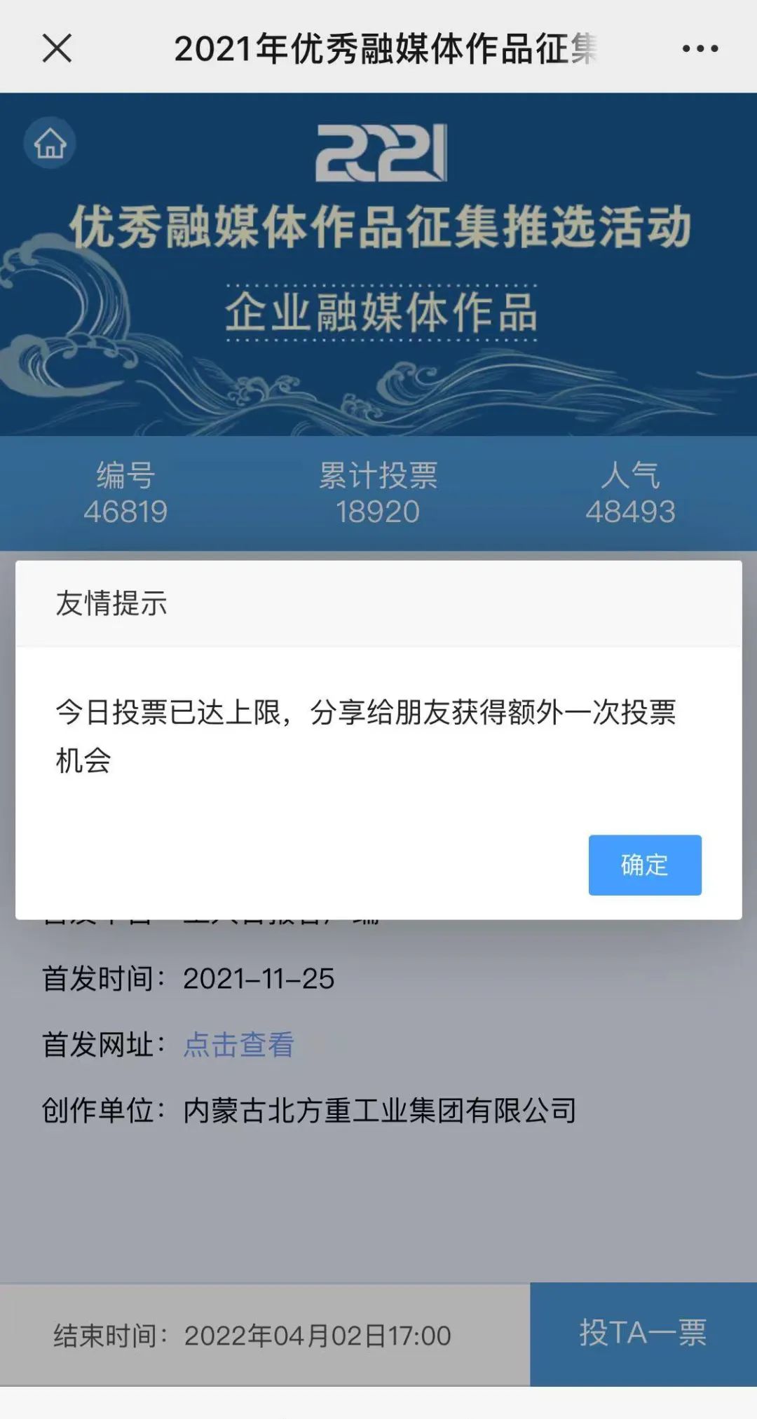 近日,由“文化強國”光明日報協(xié)同推廣平臺、光明網(wǎng)、北京師范大學(xué)新媒體傳播研究中心和光明天翼5G融媒實驗室共同主辦的“2021年優(yōu)秀融媒體作品征集推選活動”開啟線上投票環(huán)節(jié),經(jīng)過專家委員會評審,中國兵器工業(yè)集團北重集團《白楊伴我獻(xiàn)國防》音樂MV入選活動前二十名,并進(jìn)入網(wǎng)絡(luò)投票環(huán)節(jié)。 《白楊伴我獻(xiàn)國防》 楊樹參天 高聳云端的是兵工人 “履行好強軍首責(zé)”的壯志凌云! 深植北疆 傾獻(xiàn)沃土的是北重人 “推動高質(zhì)量發(fā)展”的壯志豪情! 白楊樹伴著我們茁壯成長 見證著我們獻(xiàn)身國防! 投票方式 1.掃描下方二維碼,進(jìn)入初始界面,點擊“企業(yè)融媒體作品征集”,進(jìn)入投票界面點擊《白楊伴我獻(xiàn)國防》,點擊“投TA一票”; 2. 每人每日可投10票,直至提示投票達(dá)到上限即可; 3.投票時間:2022年3月17日09:00-2022年4月2日17:00。 來源/光明網(wǎng)、北重集團 |