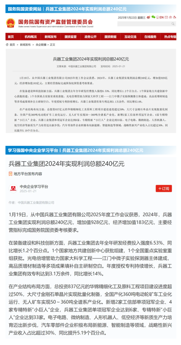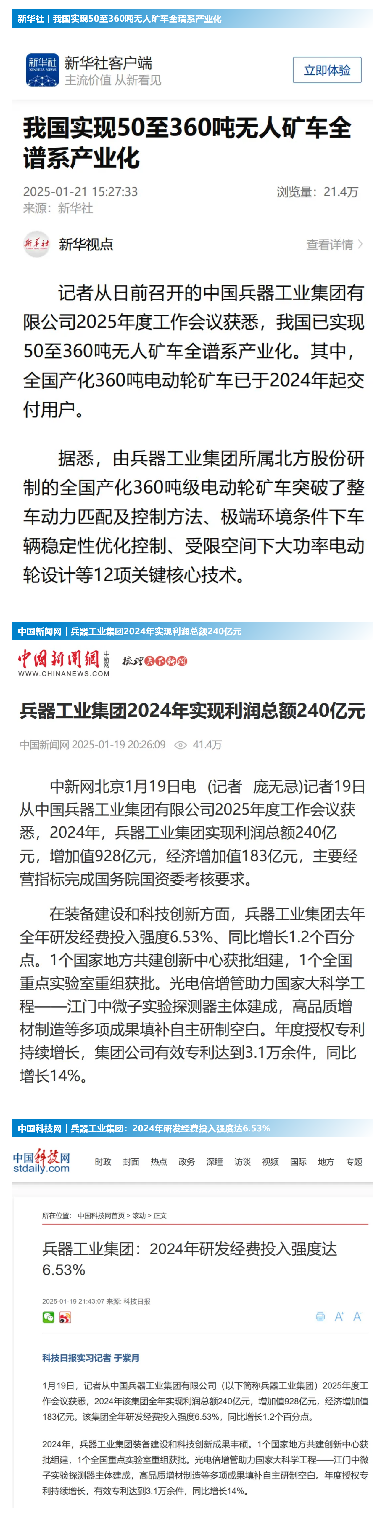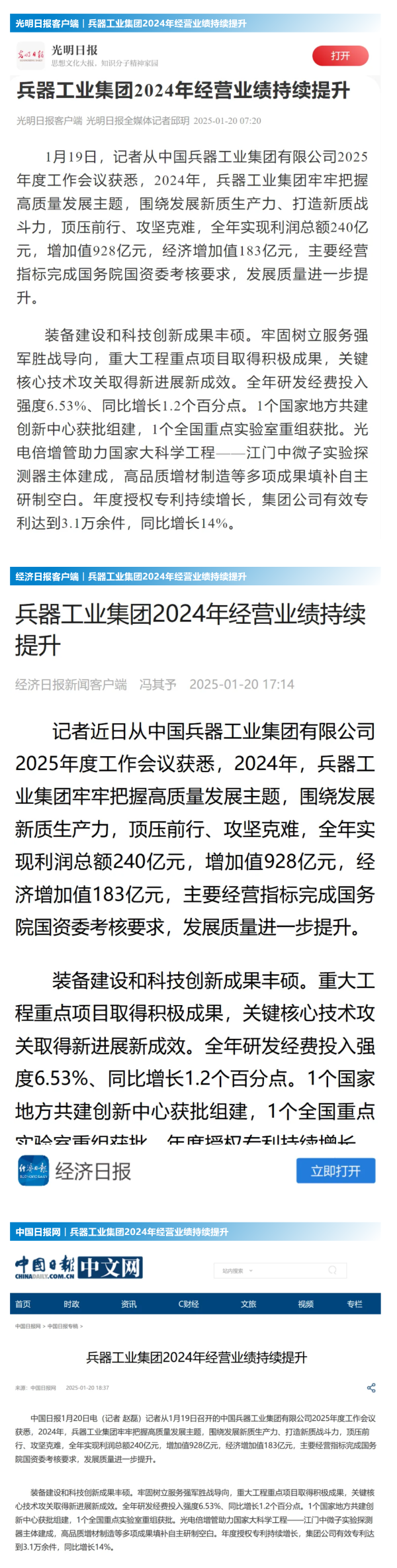 1月19日至20日,中國兵器工業集團有限公司2025年度工作會議在京召開,會議總結2024年工作,分析形勢任務,明確工作思路,部署2025年工作。 集團公司2024年取得的成績及下一步重點工作受到社會媒體廣泛關注。新華社、中國新聞網、中國科技網、光明日報客戶端、經濟日報客戶端、中國日報網、國務院國資委網站、學習強國中央企業學習平臺、新浪網、網易網、搜狐網、騰訊網、鳳凰網等中央主流媒體、國家部委網站及知名網絡媒體對集團公司2025年度工作會議進行了報道,重點關注集團公司經營業績、科技創新、產業結構布局優化等情況。其中,新華社以《我國實現50至360噸無人礦車全譜系產業化》為題,重點報道了集團公司在推動智能制造水平提升方面取得的成效;中國新聞網、光明日報客戶端、經濟日報客戶端、中國日報網等就集團公司2024年度經營業績及各項工作取得的成果進行報道;中國科技網著重報道了集團公司在科技創新和優化產業結構布局方面的最新進展。集團公司門戶網站、微信公眾號、微博等新媒體平臺以及《中國兵工報》也對集團公司工作會議進行了及時報道,各成員單位紛紛對相關內容進行轉載,引發全系統關注。 集團公司職工及廣大網友熱議工作會 “2025年工作會為我們指明了發展方向、明確了奮斗目標,面對全新的機遇和挑戰,作為兵工人深感責任重大。” “科技是第一生產力,一定要以科技創新引領新質生產力發展,為高質量發展提供支撐。” “把各項工作做深、做實、做細,努力為集團公司高質量發展添磚加瓦。” “2024年中國兵器展示了大國重器,祝新的一年中再創輝煌!” |